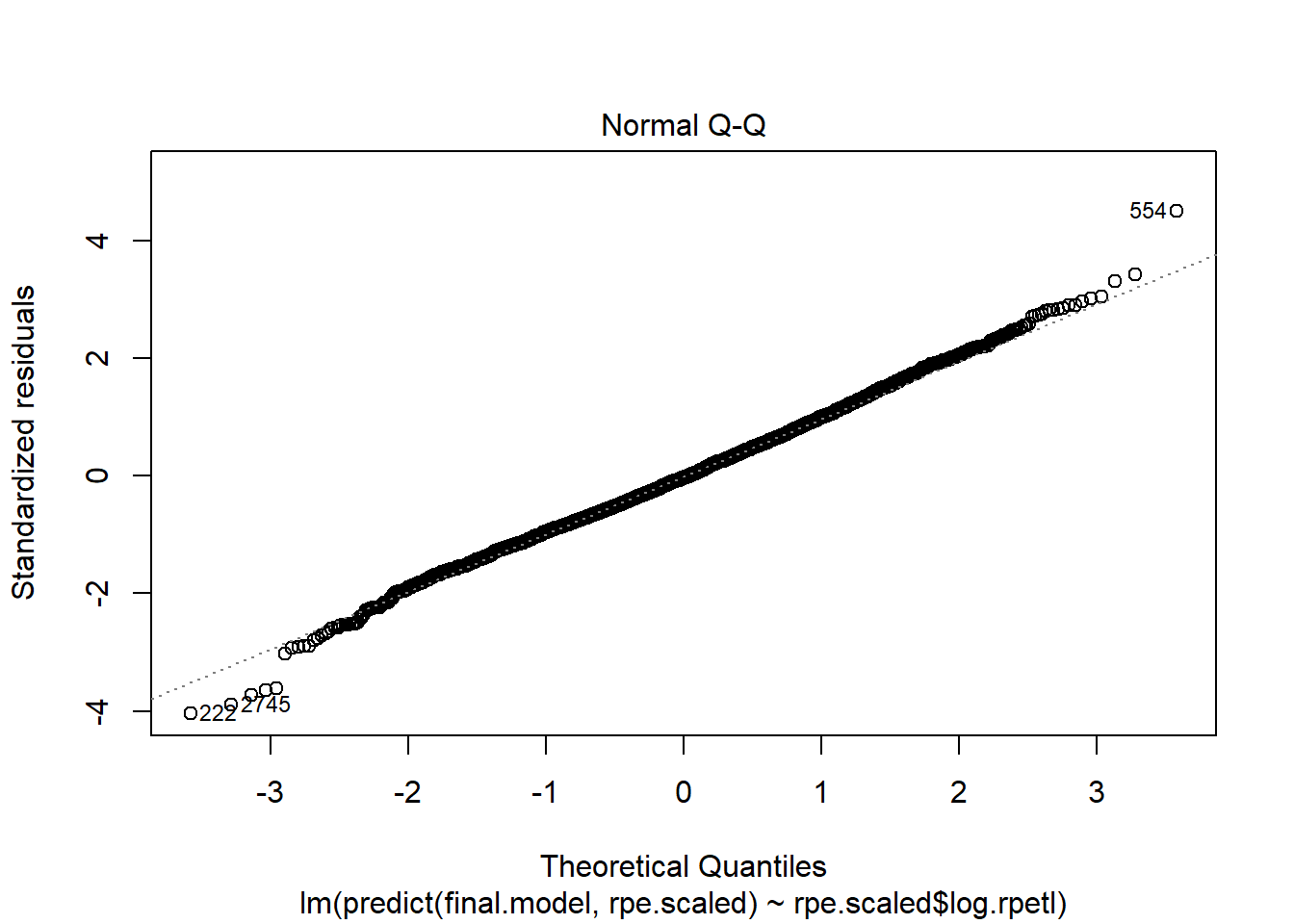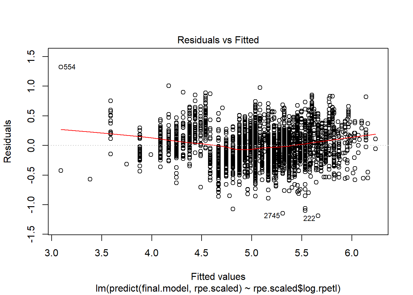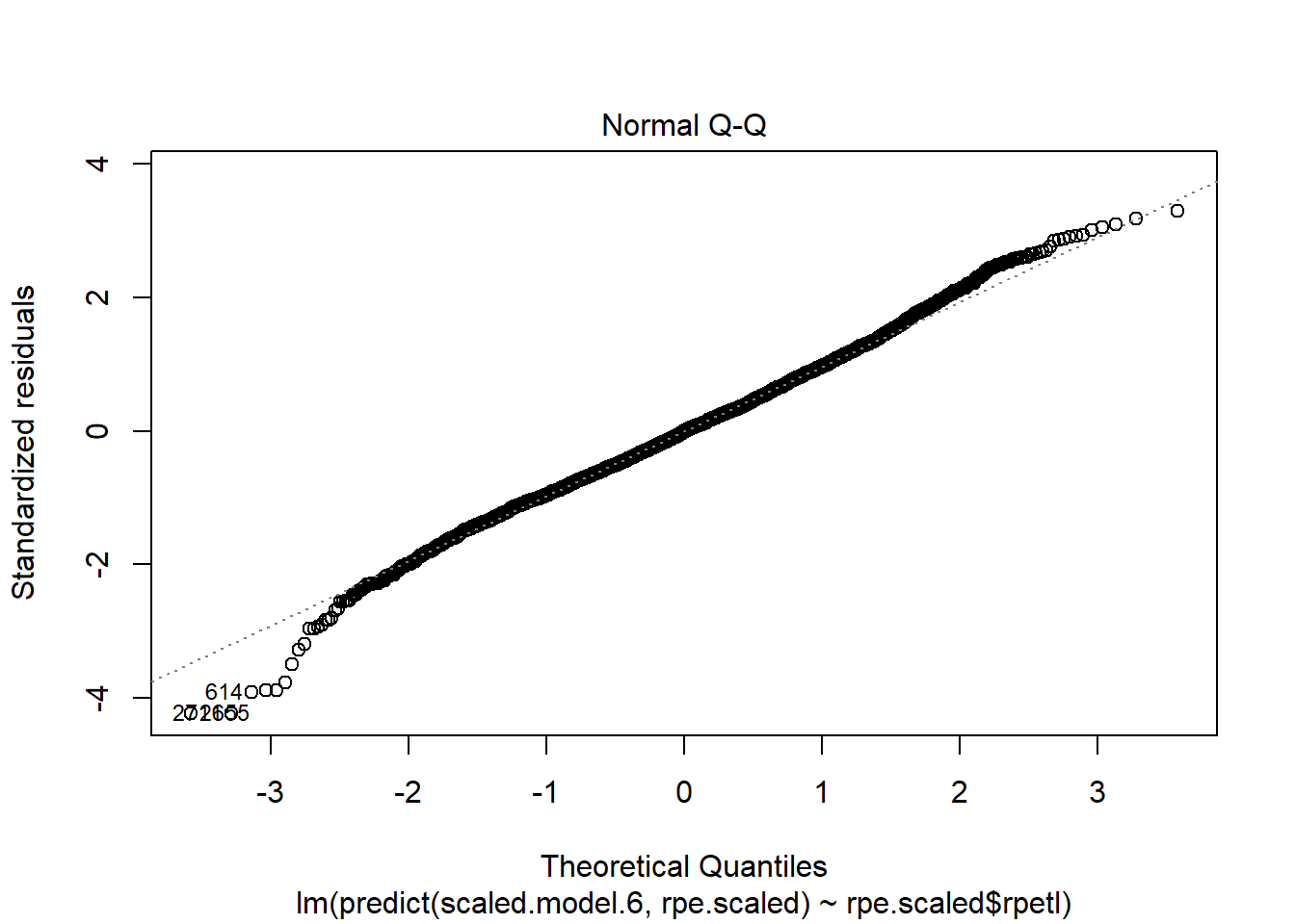 Given we’re dealing with heteroscedastic–but relatively normal–residuals, one way to correct heteroscedasticity in our model is transformation of the dependent variable. Since rpetl is positively skewed, our main options are log transformation and square root transformation. Both tend to be useful for “pulling in” the tail of a skewed distribution, but log transformation is the more common of the two in sports science research. Hopkins goes into some detail as to why if you’re interested. Also, there’s some discussion on log transformation in chapter 5 of [3]. Let’s add natural logged rpetl to the rpe.scaled data frame then re-run model 6. We’ll call this model final.model.