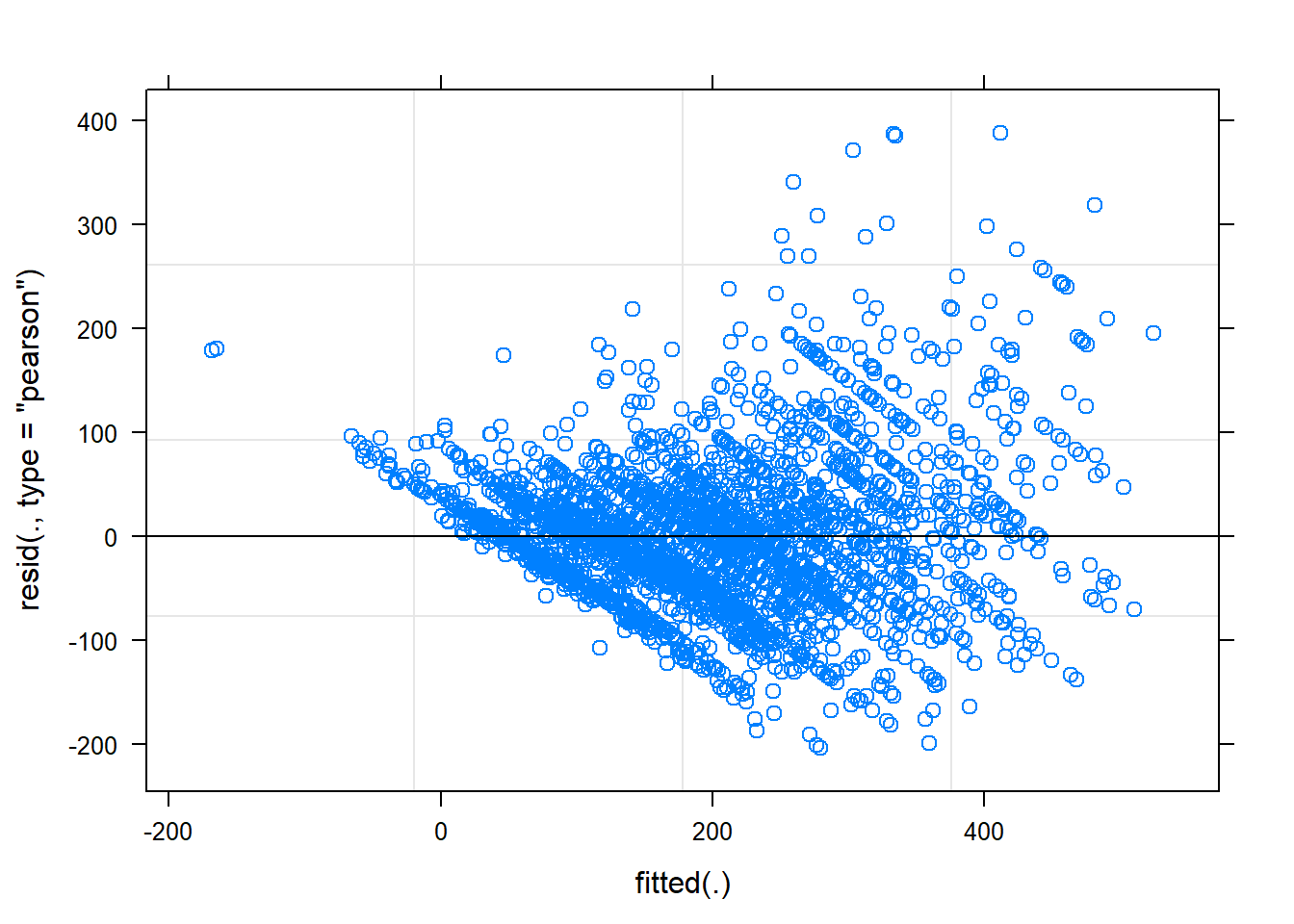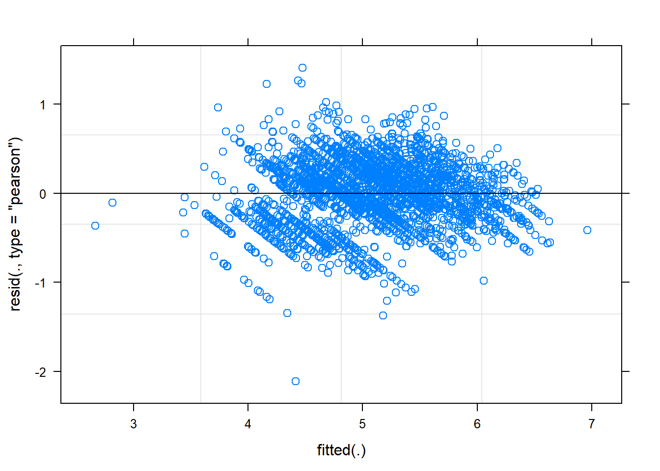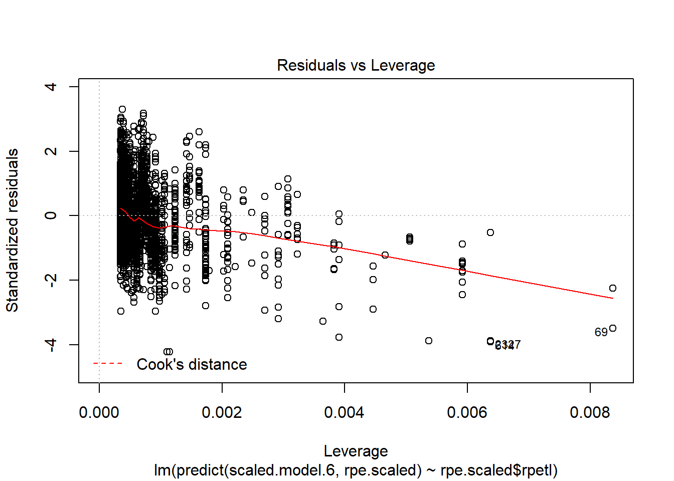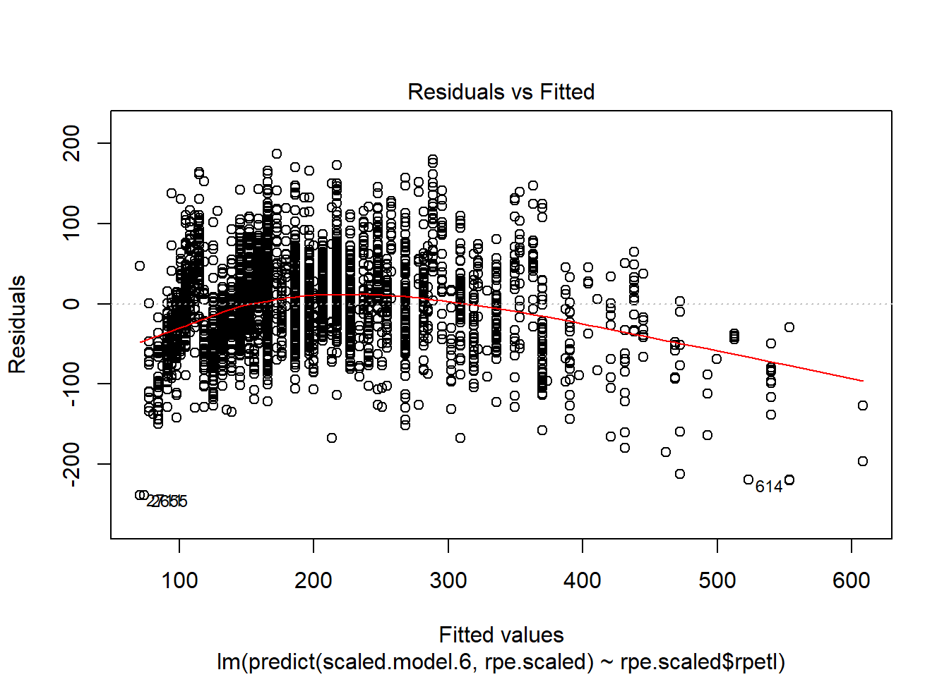 Given we’re dealing with heteroscedastic–but relatively normal–residuals, one way to correct heteroscedasticity in our model is transformation of the dependent variable. Since rpetl is positively skewed, our main options are log transformation and square root transformation. Both tend to be useful for “pulling in” the tail of a skewed distribution, but log transformation is the more common of the two in sports science research. Hopkins goes into some detail as to why if you’re interested. Also, there’s some discussion on log transformation in chapter 5 of [3]. Let’s add natural logged rpetl to the rpe.scaled data frame then re-run model 6. We’ll call this model final.model.