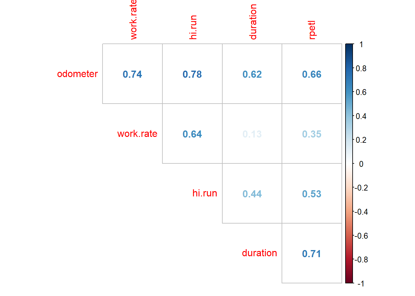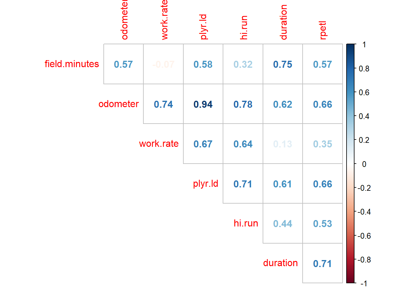 If you’ve ever seen a GPS output file, you’ll know they can be pretty overwhelming. When I was with the soccer team, Catapult Sprint could spit out something like 250 variables (I think OpenField has even more). We exported 75; we actually looked at 7. Those other 70-ish variables were of the just-in-case variety–the variables you may want to look at one day, but realistically you know you’ll never give them a second glance. But hey, you have them. Anyway, of those seven variables, research has shown there’s a strong correlation between sRPE, total distance, and Player Load (PL) and a nearly perfect correlation between total distance and PL. We used both when it came to progamming our practice sessions because they do provide slightly different information, but from a model-building standpoint the nearly perfect correlation (aka, multicollinearity) between total distance and PL is problematic. It will bias the model coefficients and affect our ability to interpret the model and individual variable importance within the model. So step one in our process will be to examine the correlation coefficients between the variables in our dataset. We can examine the relationships between our variables very easily with cor() from the base stats package and the corrplot package.