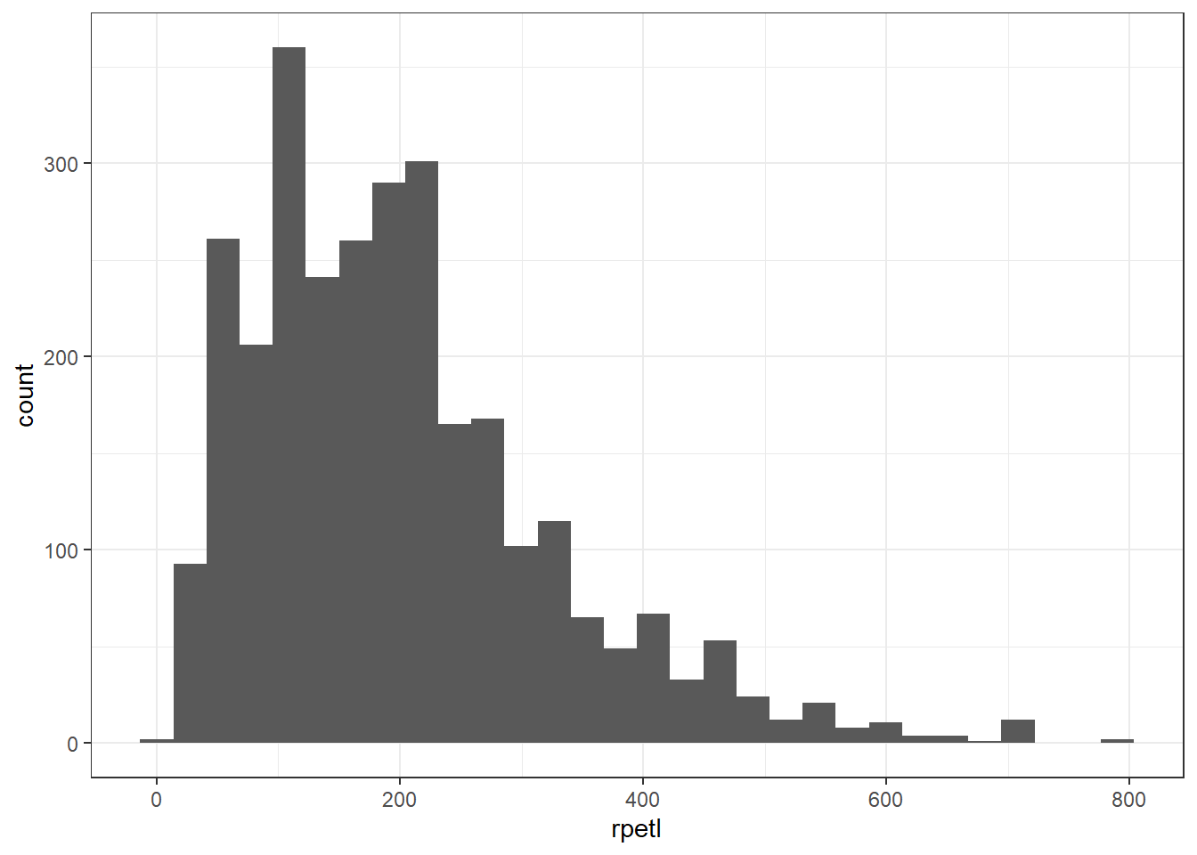 ggplot(rpe.data, aes(x = rpetl)) + geom_histogram() + theme_bw()