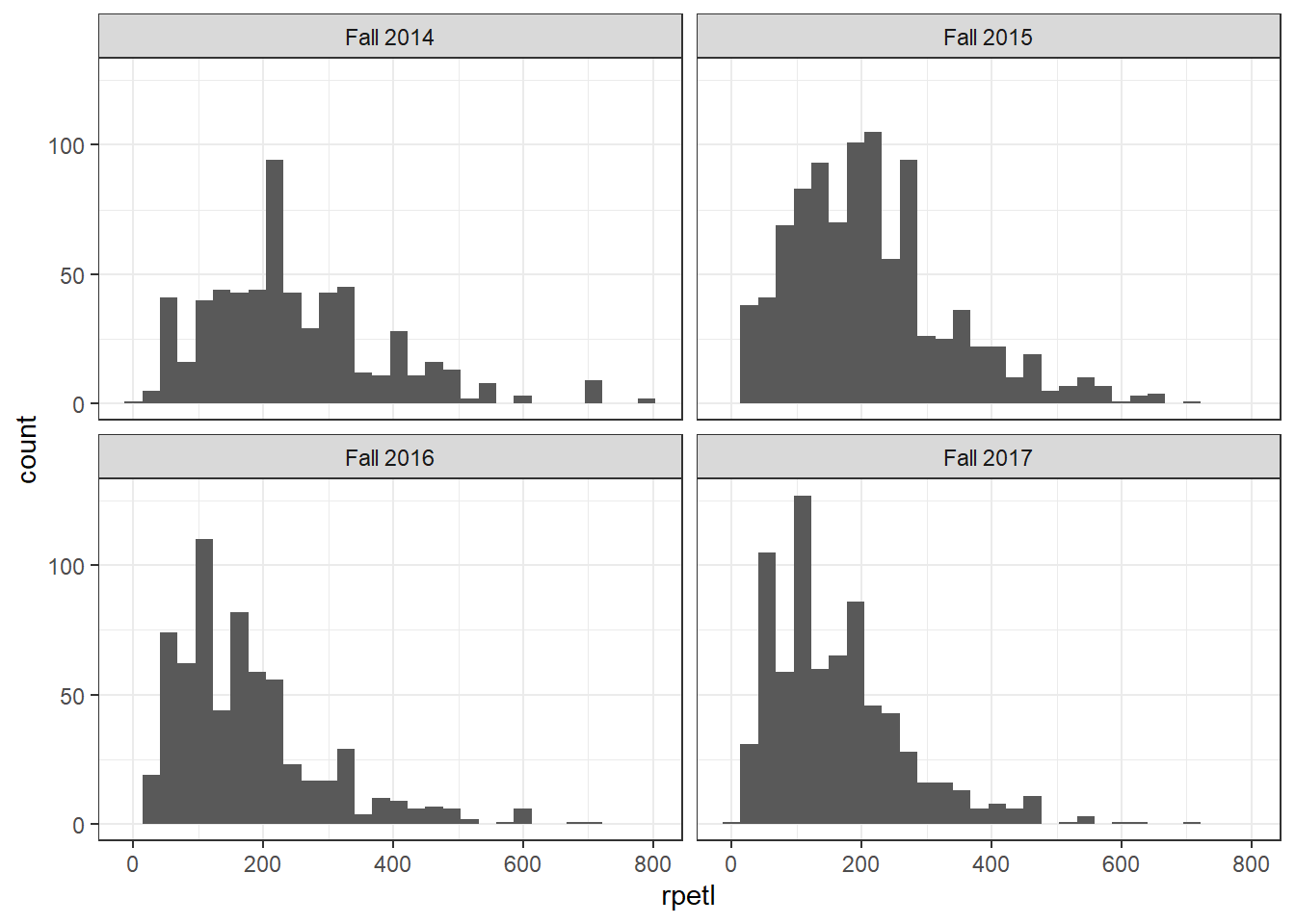 The first step in the model building process is always to examine your data visually. Visualizations help us understand what we’re working with and can aid us in fitting models that are appropriate for the dataset. Let’s start off by plotting histograms of the pooled rpetl values and rpetl for each season.