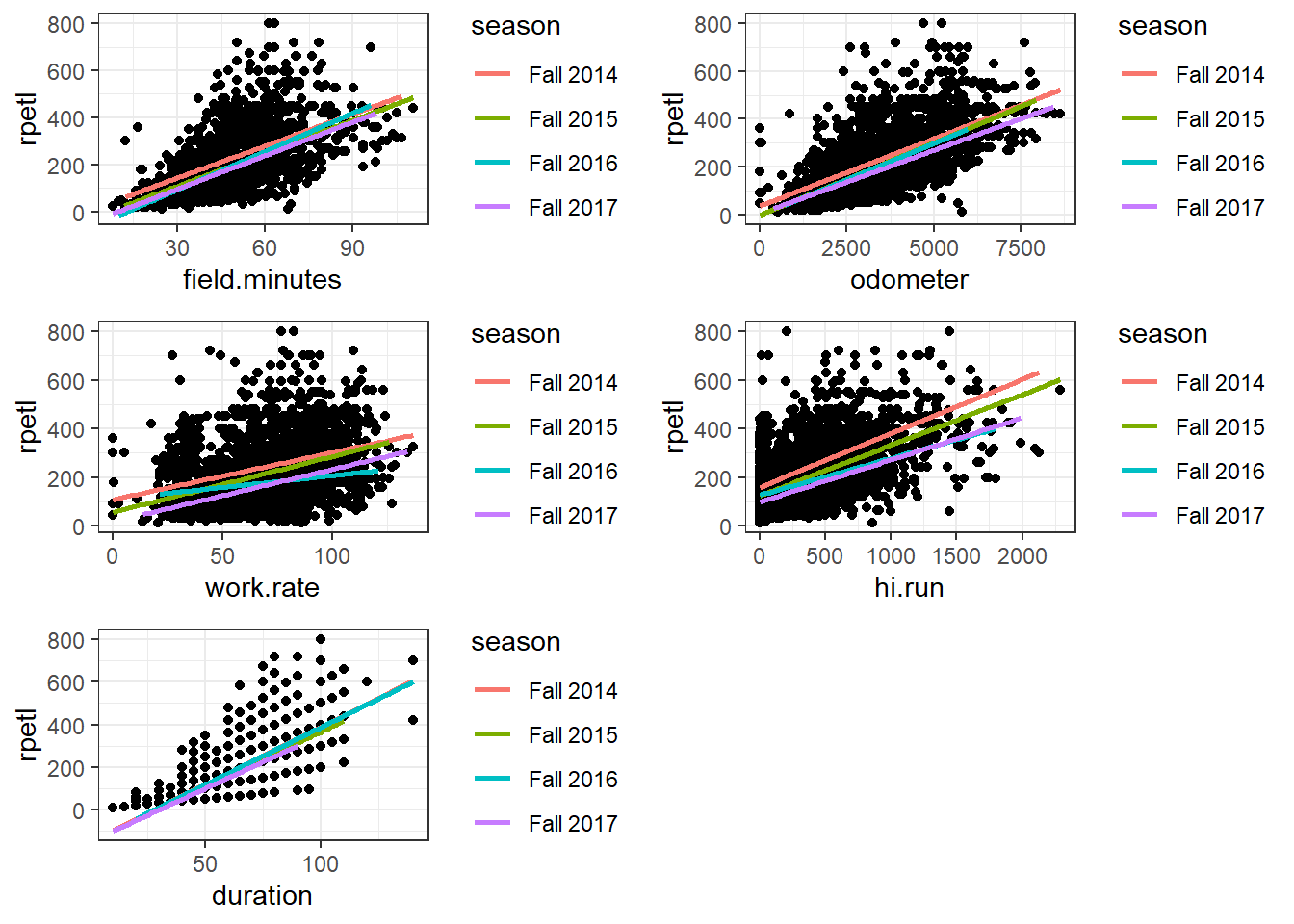 gridExtra::grid.arrange(rpe.minutes, rpe.odometer, rpe.rate, rpe.hirun, rpe.duration)