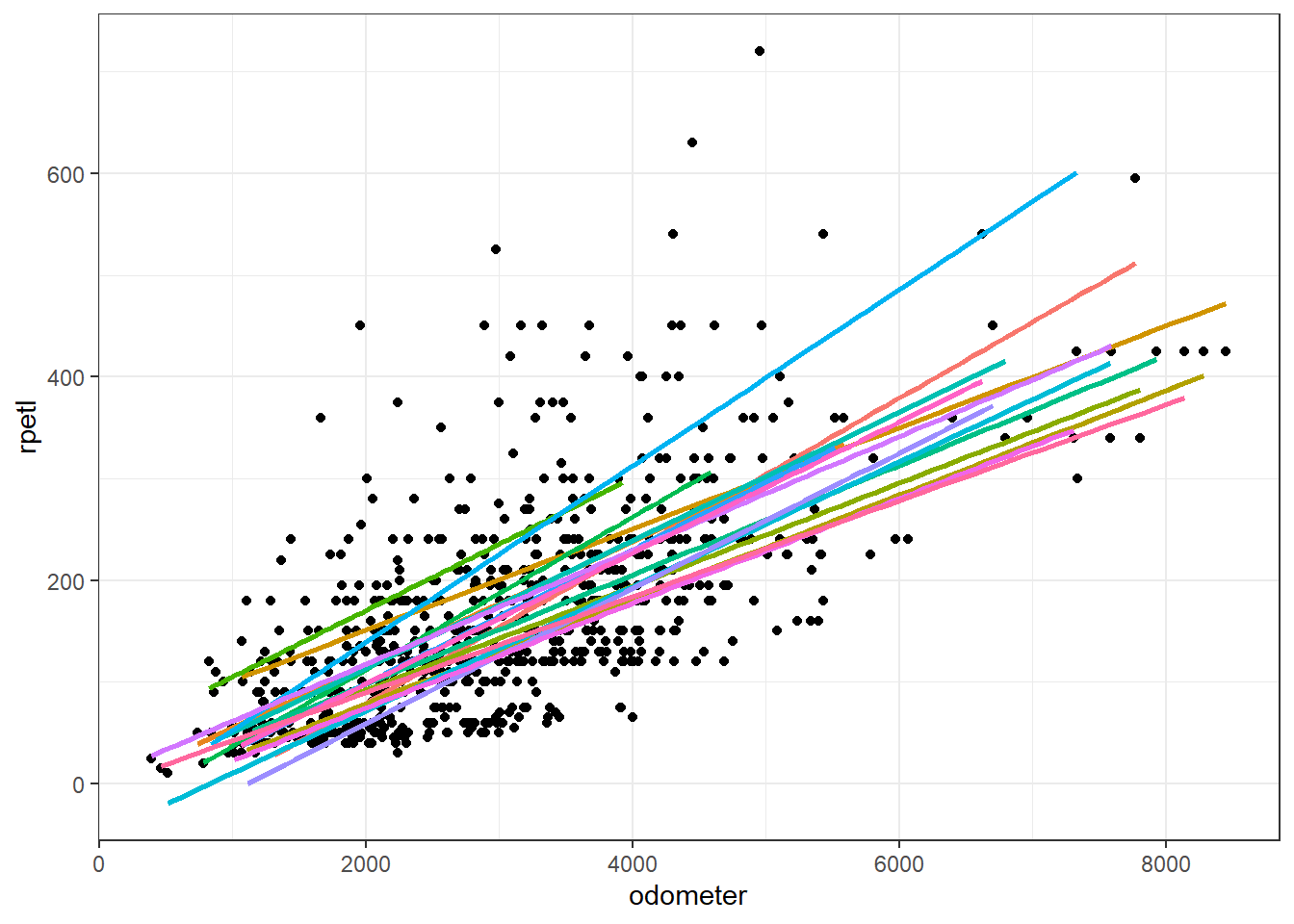 In the above model, we’ve defined athlete nested within season as a random intercept effect. That means the model assumes the slope of the relationship between the predictors and sRPE is the same across athletes, but the intercept of the model for each athlete is in a different location each season. This makes sense when you think about it. We know sRPE is a “global” indicator of training intensity; that is, it’s affected by both the physiological and psychological state of the athlete (fitness level, fatigue, outside stressors, etc.). So we would expect the resultant rpetl to differ in magnitude between athletes and to differ within athletes across seasons. We can see this in the example plot below. Notice a majority of the athletes’ regression lines are in different locations.
