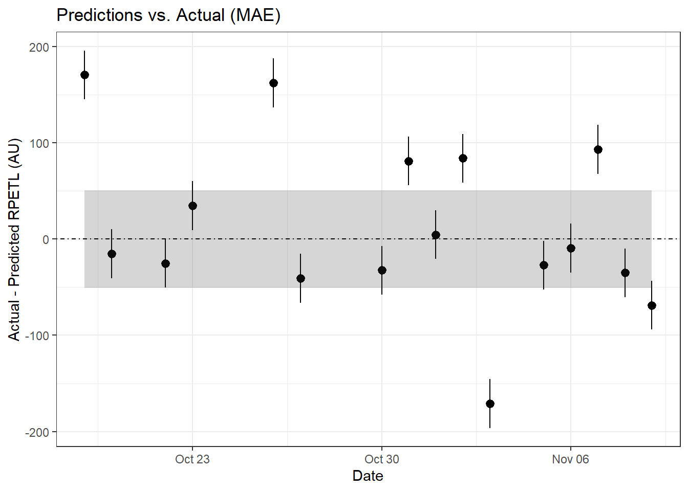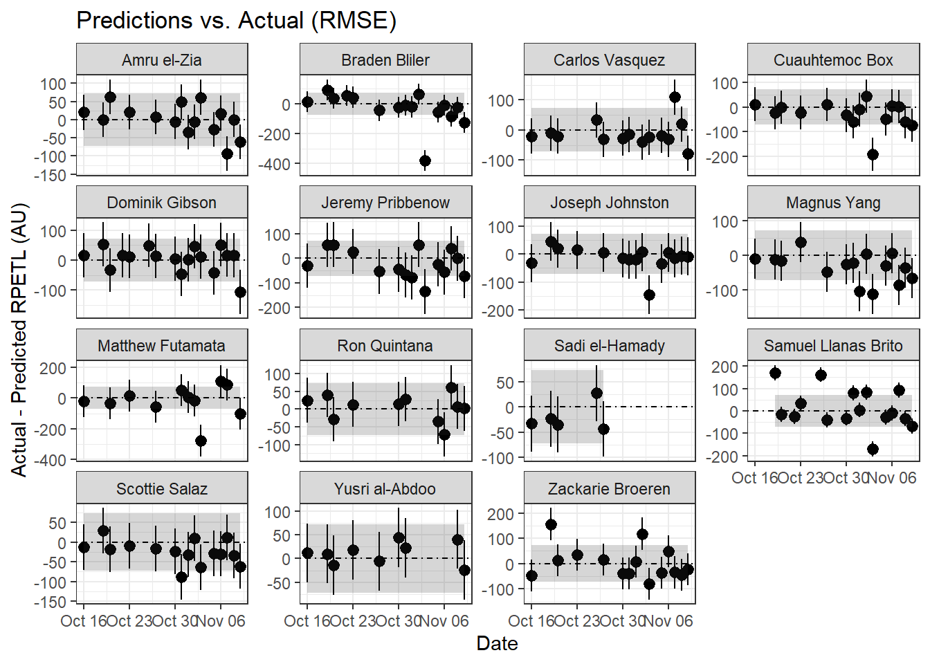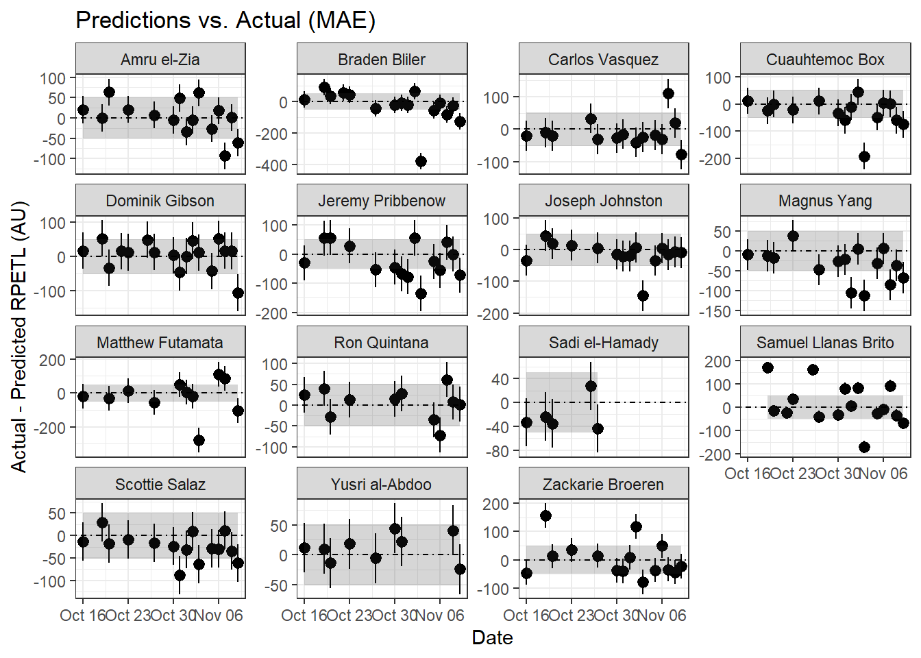 ## athlete individual.MAEIt’s pretty interesting to examine the spread of the prediction errors among athletes. I would wager we could improve the model’s predictive accuracy by accounting for pre-training wellness, previous match outcome, injury status, MD minus, and other contextual factors, but I think a RMSE of ~ 72 units (range 33 - 118) and MAE of 51 units (range 25 - 81) will be acceptable for today’s example. Further, an approach similar to [2], where anomalous points produced by sickness and injury are retroactively removed, might be another way to improve the model’s predictive ability. Unfortunately, we didn’t collect contextual data like that, so we’re stuck with what we have.