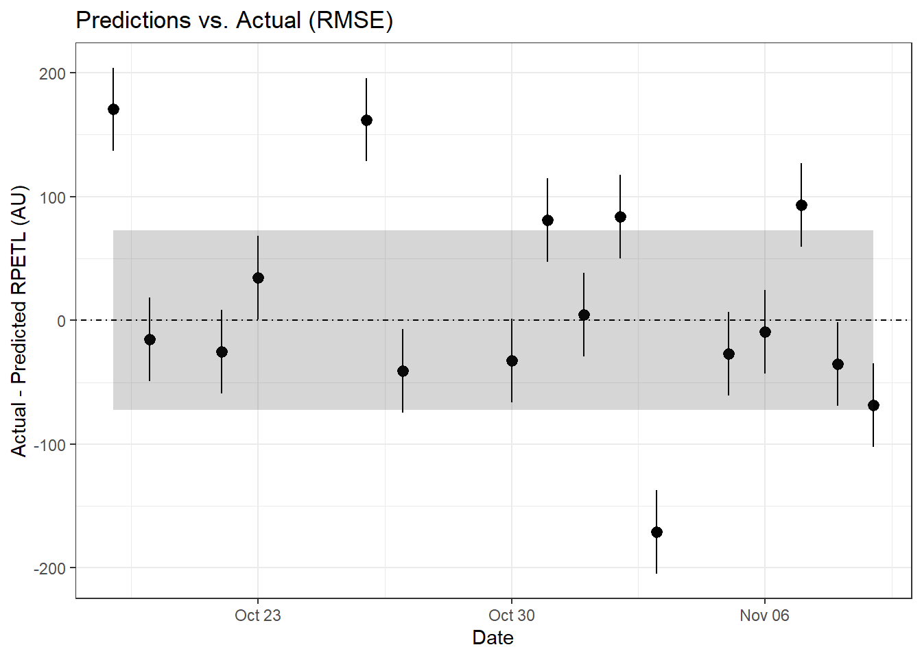 ## boundary (singular) fit: see ?isSingularUnder normal circumstances, you would probably be comparing several methods to model the relationship between external load metrics and rpetl. In that case, you would go through a cross-validation process similar to [1], where you split your data into training and test sets to determine which method is most effective in predicting previously-unseen data. We’ll leave that for some other time, though. For now, let’s attempt to tackle a real-life problem: using our model, can we identify anomalous rpetl values? I’m going to split the data so that we’re attempting to predict rpetl values for the final three weeks of the 2017 season. I’ll also re-create the model based on this trimmed dataset.